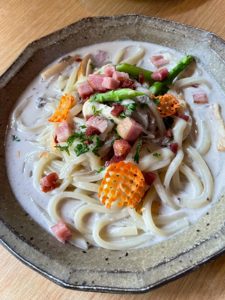 そしてもう一つおススメ!今年何回もお世話になっている“なかまっこ”さん、お好み焼きが本当に美味しいお店ですが、推しは期間限定メニューの『舟形マッシュルーム&角切りベーコンのクリームスープうどん』1,100円(税込)パスタじゃなくてうどんなんです、食べたことがない美味しさ、ここでしか味わえない逸品だと思います、10月末までの期間限定、こちらも是非お試しください!
